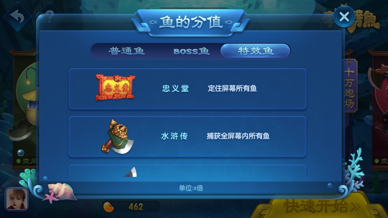特效鱼除了可以带来一定的连带收获,体验金币爆不停的快感外。大家要懂得利用不同特效鱼的特点,提高捕鱼胜率。例如打Boss的时候,就可以利用特效鱼做为助攻,快速拿下Boss。比如利用【忠义堂】的定屏效果,冻住Boss后火力全开。【水浒传】适合鱼群密集的时候,击一得百,一炮顶过去十炮。